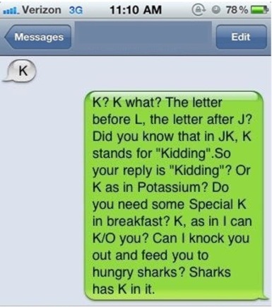Funny StuffK…. whateverrrr!!! I find it really annoying when someone replies back with just a ‘K’. Just don’t bother to reply if that’s all you’ve got to say! Grrrr! And it seems like I found a way to reply back to the ‘K’… Made me laugh. ๐ ~ Kamal Share this:Tweet Click to share on WhatsApp (Opens in new window) WhatsApp Click to email a link to a friend (Opens in new window) Email Like Loading... Related