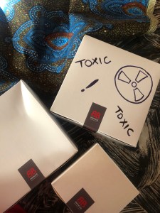 The goods were delivered to my door in a lovely reusable bag and then I howled with laughter. The Bastard had obliged with the โToxic โlabelsโฆ